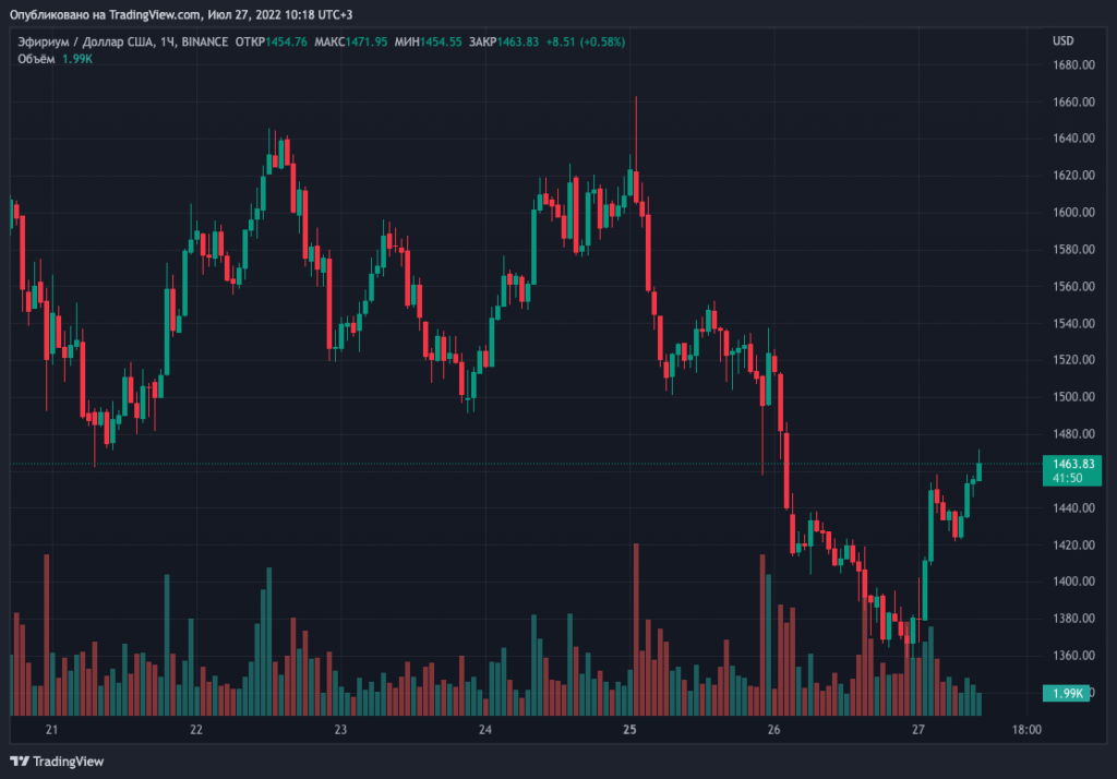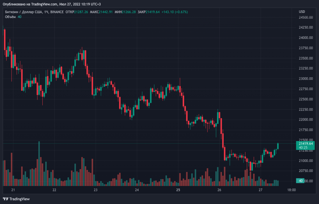 В настоящее время биткоин держится вблизи $21 420, Ethereum — выше $1460.