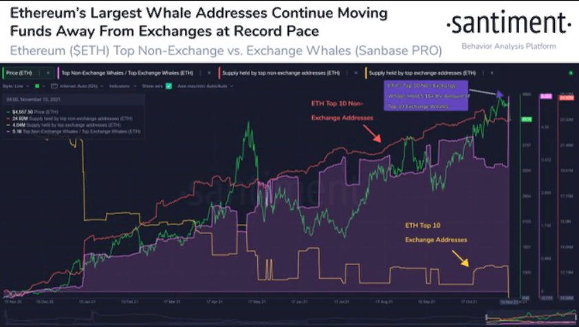Киты отправляют эфир на автономное хранение с января 2021 года. Однако резкое сокращение биржевого баланса криптовалюты наблюдается с начала октября. Именно тогда мы и увидели очередное восхождение монеты, так как ее предложение на торговых площадках сократилось, что и ослабило давление со стороны продавцов.