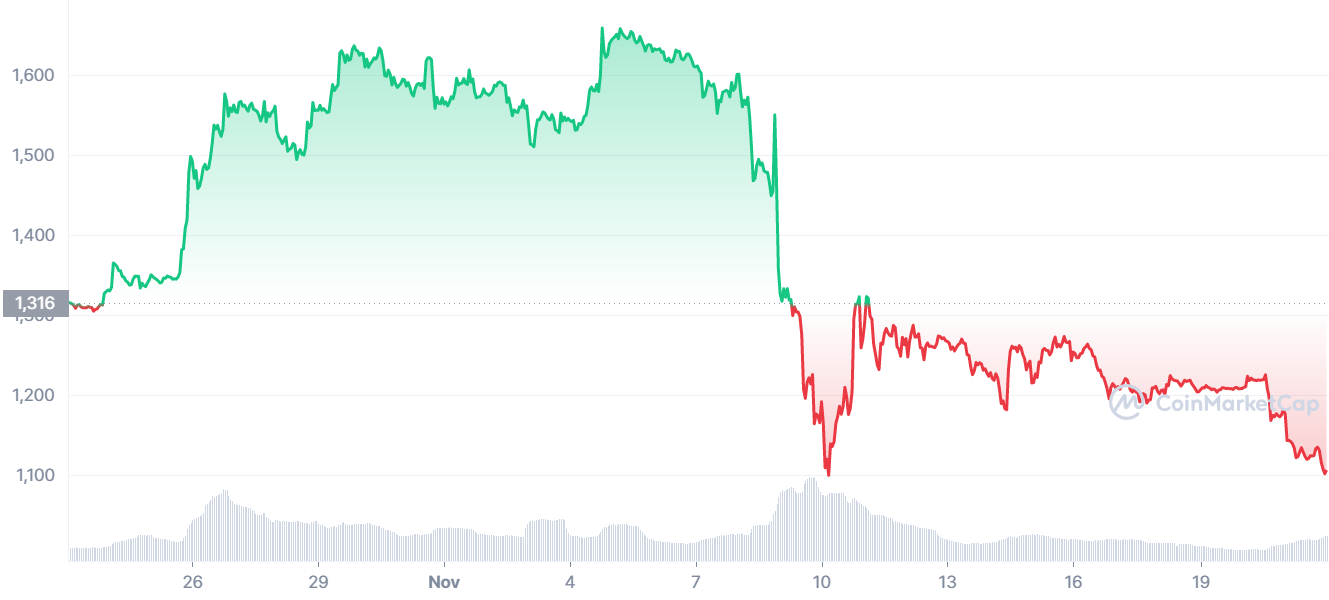 В ночь на вторник, 22 ноября, курс ETH упал до $1105, и появились риски отката ниже $1000.