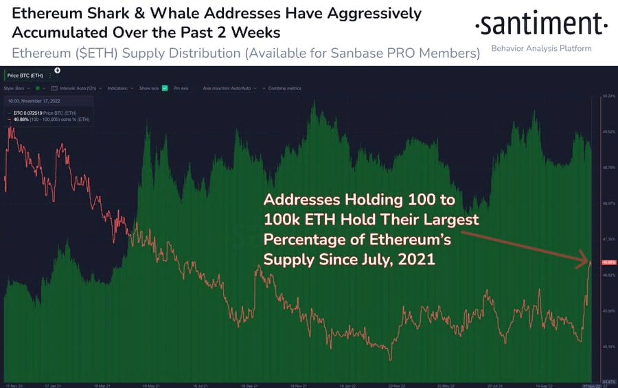 Инвесторы активизировались в тот момент, когда ETH на фоне крушения биржи FTX стал терять в стоимости вместе с биткоином. Резервы китов в эфире возросли примерно на 3,5%, подчеркнули аналитики.