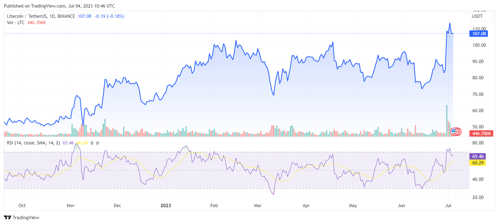 На прошлой неделе лайткоин (LTC) продемонстрировал сильный рост. Криптовалюта в выходные превышала $112 – это самый высокий уровень с апреля 2022 года. LTC за последние семь дней увеличился более чем на 22%.