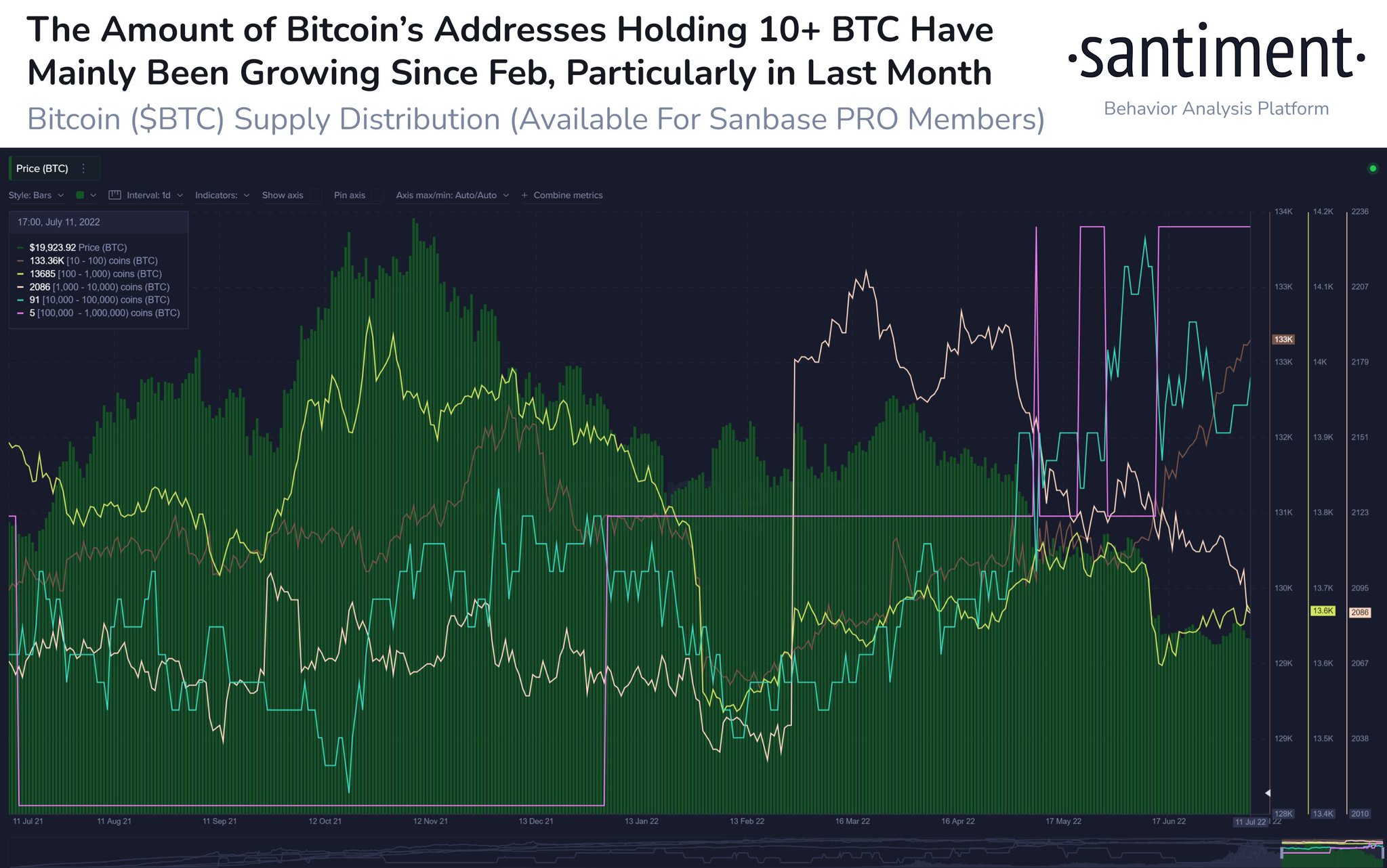 Команда Santiment выяснила, что пока паникеры сбрасывали BTC, средние и крупные кошельки покупали падение. В отчете исследователей говорится, что июньским крушением биткоина воспользовались адреса, удерживающие более 10 монет.