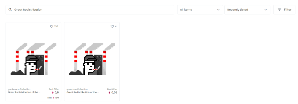NFT под названием Great Redistribution of the Climate Change Disaster выпустил пользователь маркетплейса OpenSea gaakmann. Bryan S Gaakman — один из псевдонимов Бэнкси (анаграмма от banksy anagram), который он впервые использовал на выставке Королевской академии искусств Великобритании еще в 2018 году.