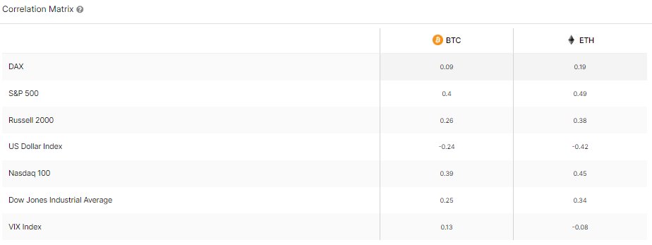 С долларом США сохраняется отрицательная корреляция – -0,24 для биткоина и -0,42 для ETH.