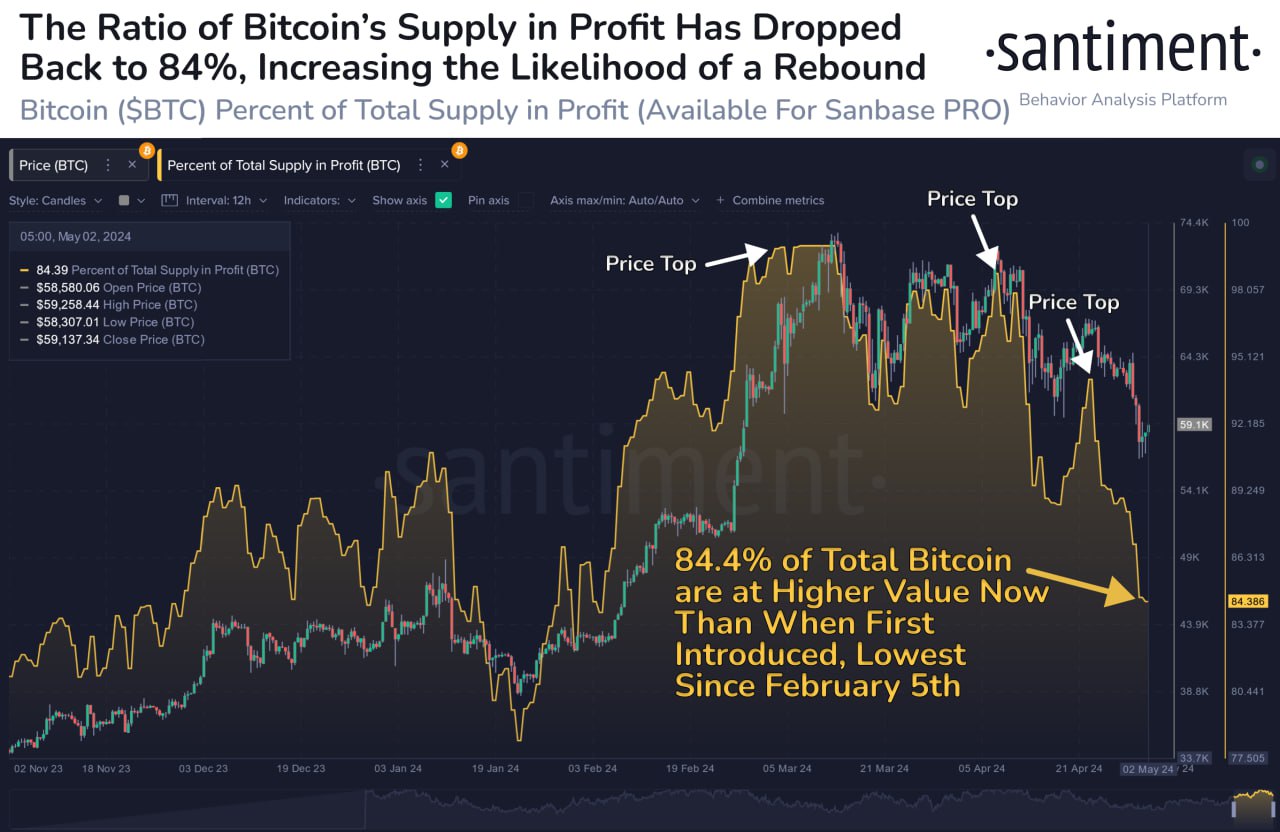 Компания Santiment выяснила, что более 84% предложения биткоина остается прибыльным, пока криптовалюта держится выше $60 000.