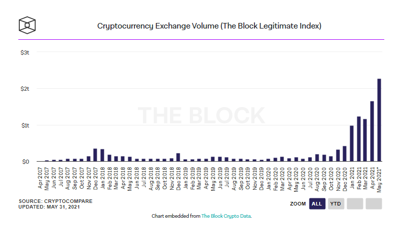 Май оказался самым успешным месяцем для криптовалютных бирж за всю историю индустрии. Как уточняет The Block, объем торгов превысил $2 трлн.