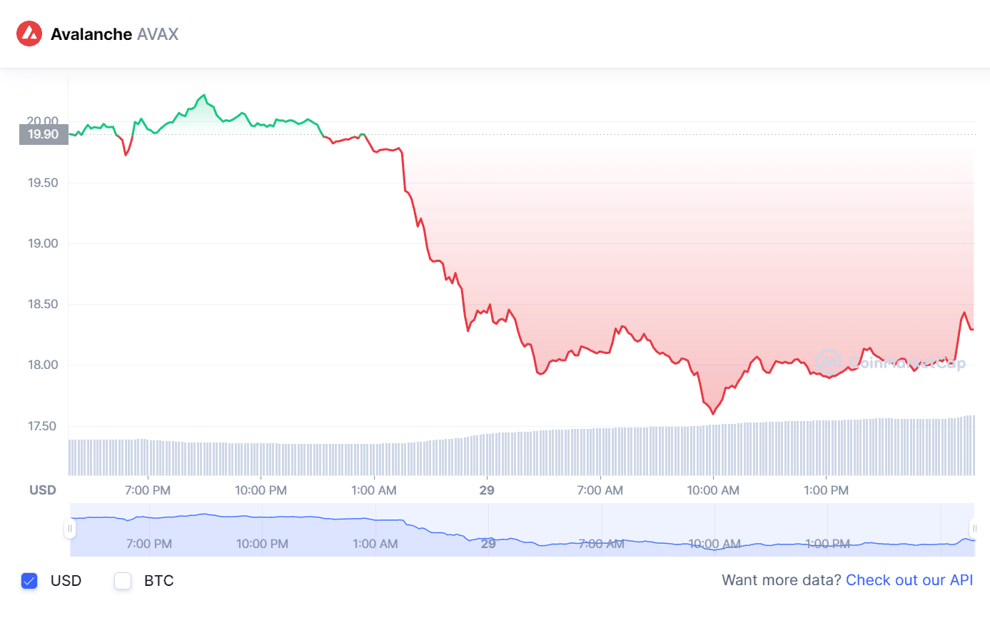Альткоин Avalanche (AVAX) понедельник, 29 августа, упал до самых низких значений с 13 июля. На момент публикации данного обзора криптовалюта торговалась на отметке $18,3.