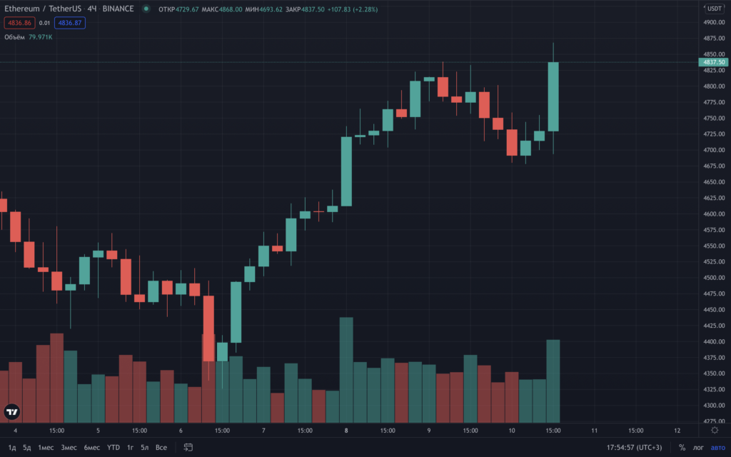 Курс Ethereum тоже обновил исторический максимум на уровне $4868. Капитализация актива достигла $577 млрд.
