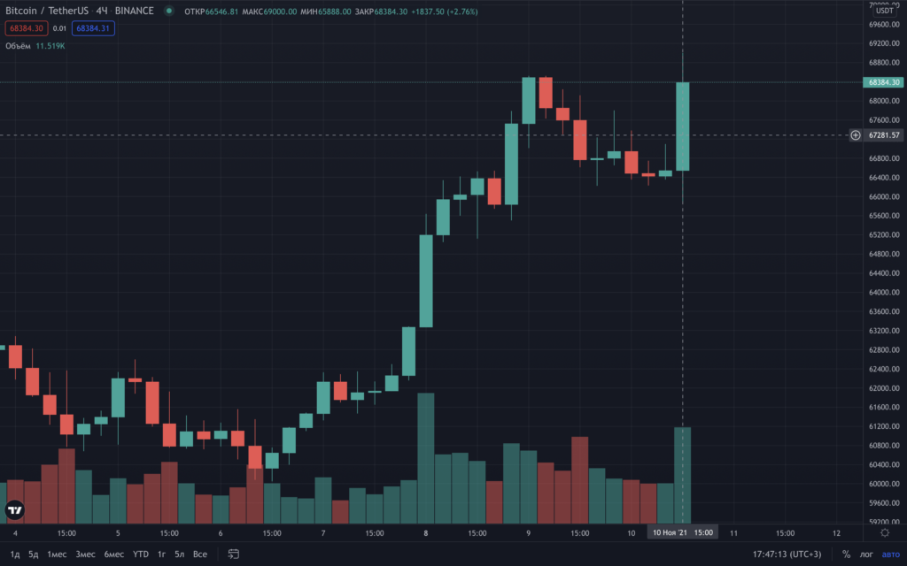 В среду, 10 ноября, котировки первой криптовалюты достигли отметки $69 000, обновив исторический максимум. Капитализация биткоина приблизилась к $1,3 трлн, согласно CoinGecko.