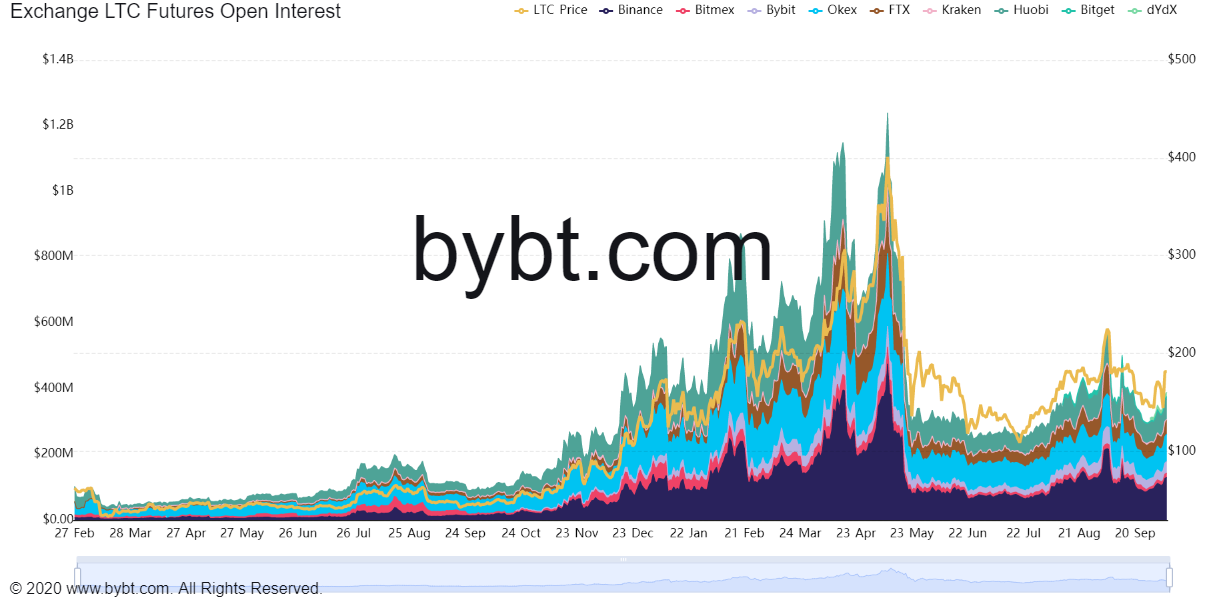 Укрепление курса LTC положительно отразилось на инвестиционной привлекательности продуктов, ориентированных на эту криптовалюту. По данным Bybt, открытый интерес к лайткоин-фьючерсам растет с середины текущей недели. Сейчас он превышает $388,73 млн.