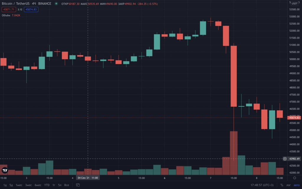 7 сентября курс биткоина обвалился ниже $43 000. Совокупный объем ликвидаций превысил $3 млрд.