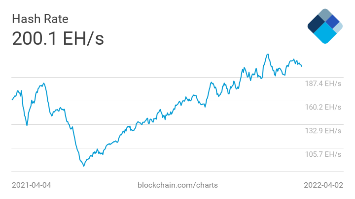 По данным Blockchain.com, хешрейт биткоина сейчас превышает 200 экзахеш в секунду (EH/s). В середине февраля данный показатель вплотную приближался к 215 EH/s.