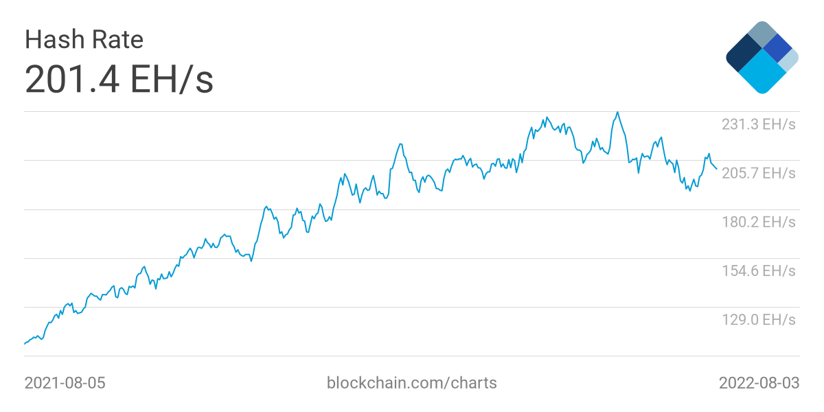 Однако активность майнеров пока остается слабой, так кака рынок снова стагнирует. По данным Blockchain.com, хешрейт BTC 3 августа упал до 201,4 экзахеш в секунду (EH/s) – это минимальное значение с 27 июля.