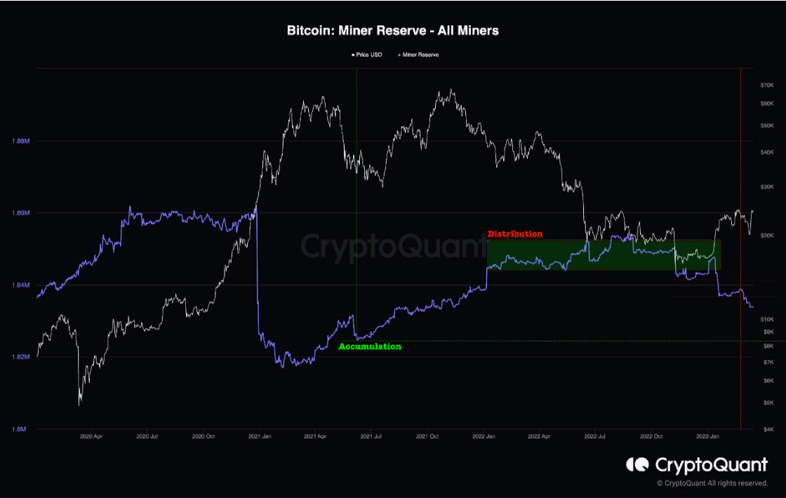 В докладе CyptoQuant говорится, что майнинг-пулы приступили к реализации как в раз в то момент, когда биткоин укреплялся на фоне банковского кризиса в США. Резервы кошельков, связанные с майнерами, сокращаются. Это говорит о том, что пулы продолжают продавать.