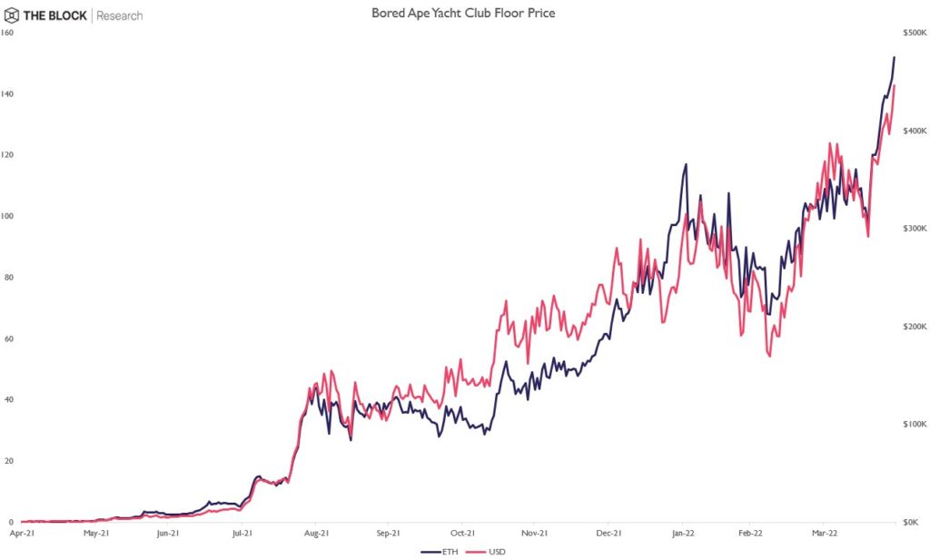 В преддверии запуска метавселенной Otherside минимальная цена невзаимозаменяемых токенов (NFT) из коллекции Bored Ape Yacht Club (BAYC) обновила исторический максимум на уровне выше $430 000.