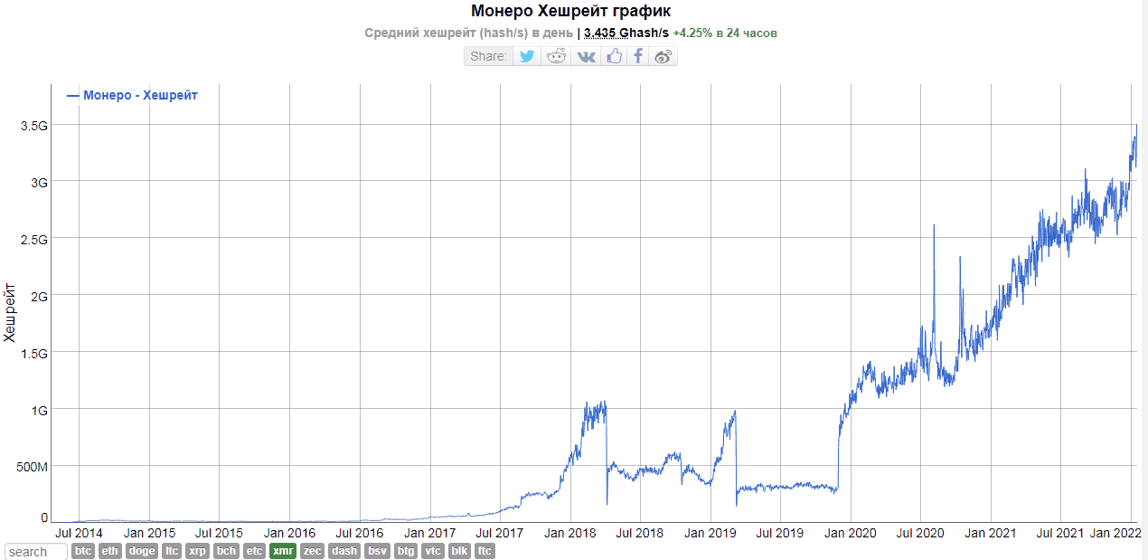 Хешрейт Monero вырос до исторического максимума - 3,503 гигахеш в секунду (GH/s).
