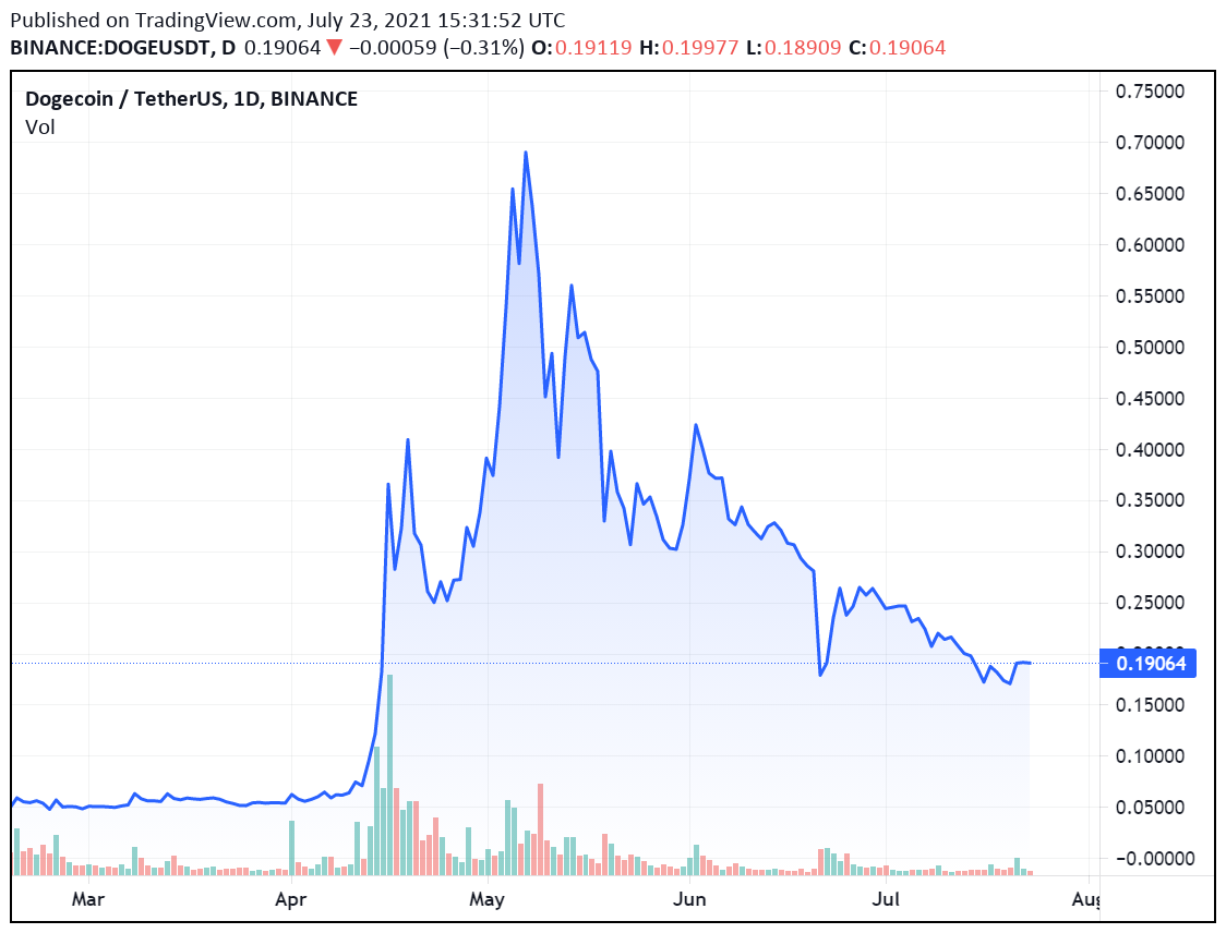 В ночь на субботу, 24 июля, цена Dogecoin увеличилась до $0,191. Капитализация криптовалюты сейчас превышает $24,937 млрд, она располагается на восьмом месте в рейтинге CoinMarketCap.