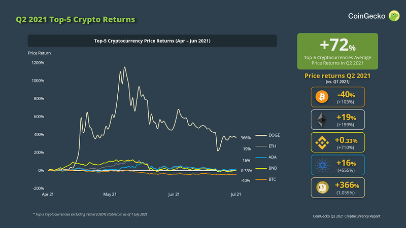 Любимая монета Илона Маска Dogecoin (DOGE) добилась самых лучших результатов в рейтинге крупнейших цифровых валют. По итогам второго квартала она взлетела в цене на 366%, говорится в отчете CoinGecko.