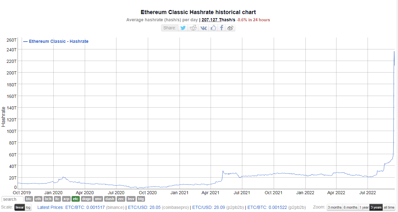 Мощности Ethereum Classic за месяц выросли почти на 500%. Основатель эфириума Виталик Бутерин сам призвал майнеров переходить на ETC, чтобы сохранить работоспособность после перехода ETH на алгоритм PoS.