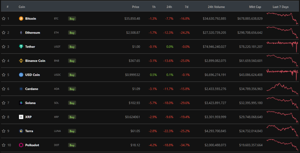 Биткоин тянет за собой и остальной рынок — все активы из топ-10 по рыночной капитализации остаются в красной зоне. Худшую динамику показали Terra (-22,3%), Polkadot (-18,8%) и Solana (-18%). Цена Ethereum за сутки снизилась на 12%, до $2508, согласно CoinGecko.