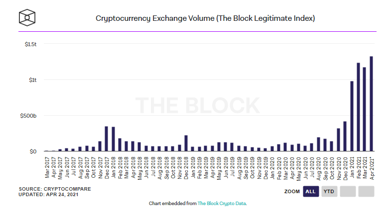 В апреле, по всей видимости, криптовалютные биржи покажут самые высокие торговые обороты за всю историю наблюдений.