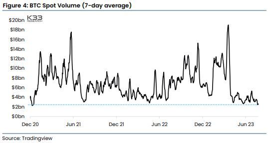 За последние семь дней объем торгов биткоином на спотовых биржах оказался на самом низком уровне с начала 2021 года.