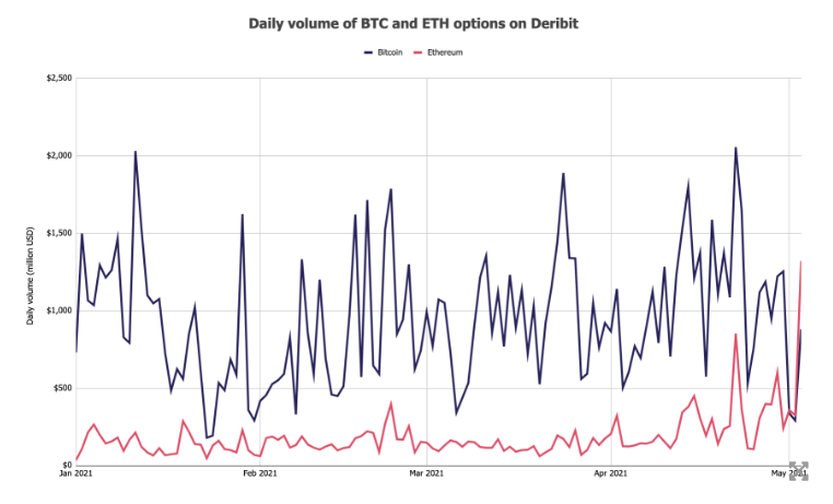 На бирже деривативов Deribit впервые в истории объем торговли Ethereum-опционами превысил соответствующий показатель по биткоину — $1,32 млрд против $879,5 млн.