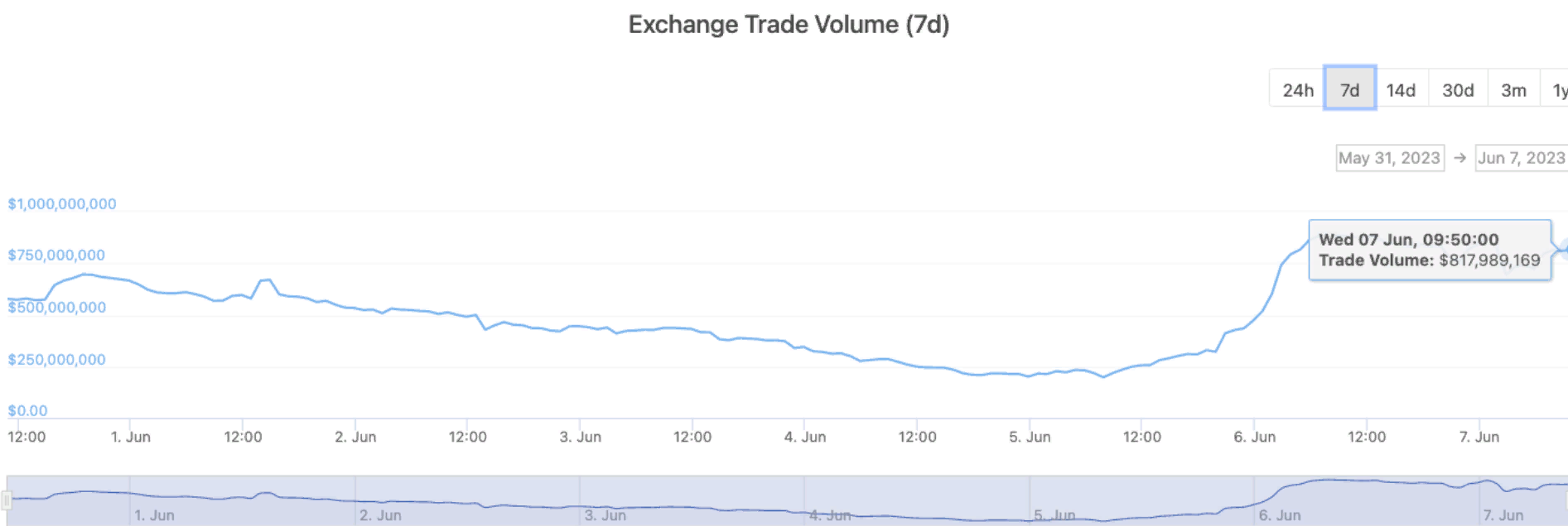 По данным CoinGecko, среднесуточная сумма транзакций с цифровыми активами на децентрализованных платформах взлетела на 444% до $790 млн. 6-7 июня была зафиксирована самая высокая активность пользователей рынка DeFi.
