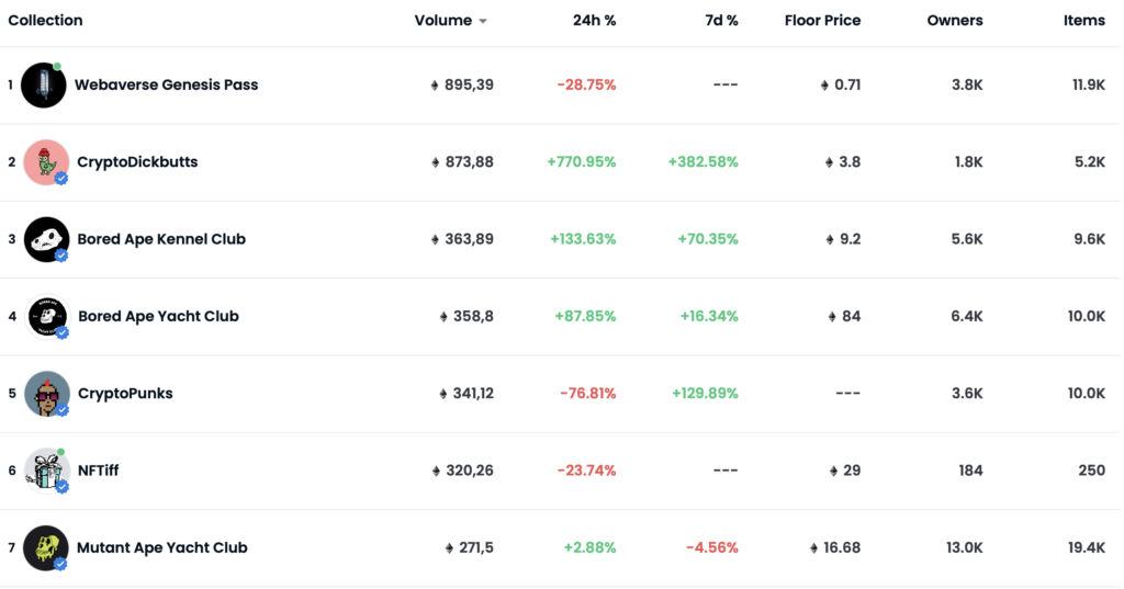 На момент написания CryptoDickbutts занимает второе место по объему ежедневных торгов, обгоняя популярные проекты Bored Ape Yacht Club, Bored Ape Kennel Club, Mutant Ape Yacht Club и CryptoPunks.