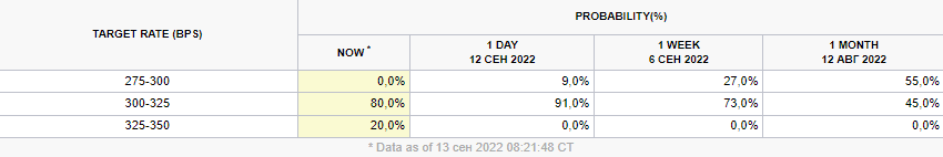 Согласно рынку фьючерсов, вероятность повышения ключевой ставки на заседании 21 сентября сразу на 75 б. п. достигла 80%. Месяц назад она составляла 45%.