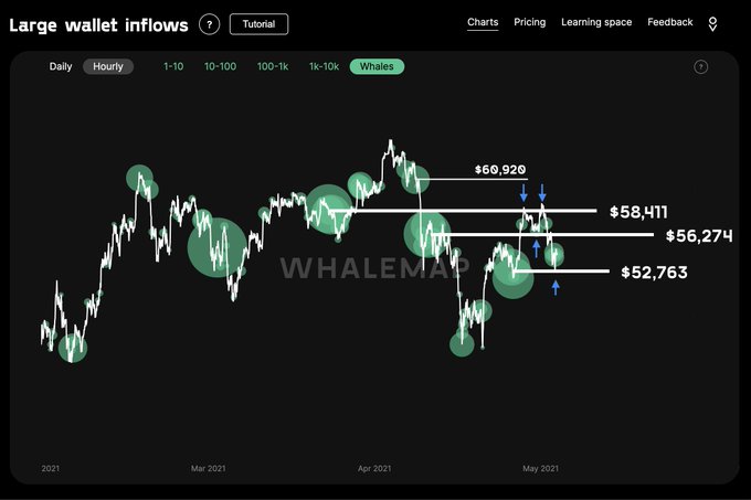 Команда WhaleMap, анализирующая поведение крупных держателей биткоина, заявила, что даже если мы вновь вступим в красную зону, поддержка должна усилиться в районе $52 763. По такой цене "киты" приобрели около 45 000 BTC. Соответственно, более значительный откат маловероятен, в противном случае крупные игроки рискуют оказаться в минусе.