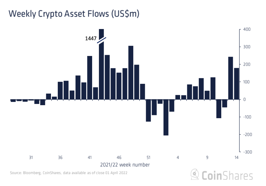 В докладе компании CoinShares, управляющей активами, говорится, что на минувшей неделе, завершившейся 1 апреля, криптофонды привлекли $180 млн.