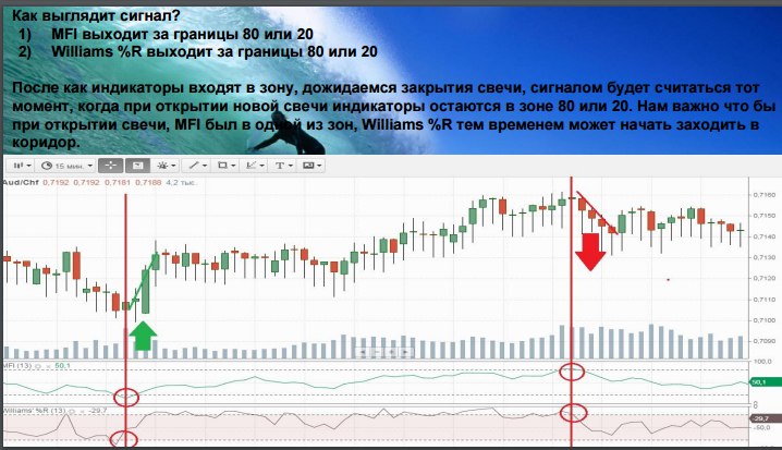 Проблема в том, что сложно словить такой момент как на скрине, когда Williams %R (13) выходил из зоны, а MFI (13) еще в зоне такие сигналы по тренду заходят на 100%