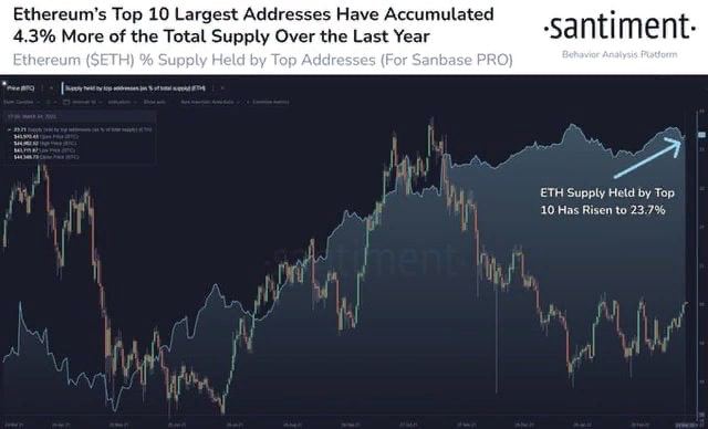 В отчете команды Santiment говорится, что киты накопили до 23,7% от общего предложения эфира. Они не собираются сбрасывать свои резервы и предпочитают отправлять ETH на автономное хранение.