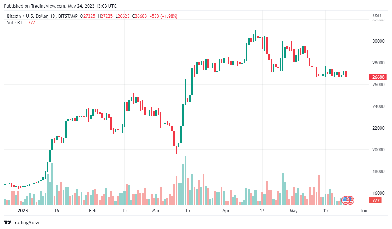 Однако европейские и американские рынки показали снижение 23 мая. Результатом ослабления активности части трейдеров стало падение цены BTC ниже $27 000 и последующий откат остальных виртуальных валют, подчеркнули эксперты.