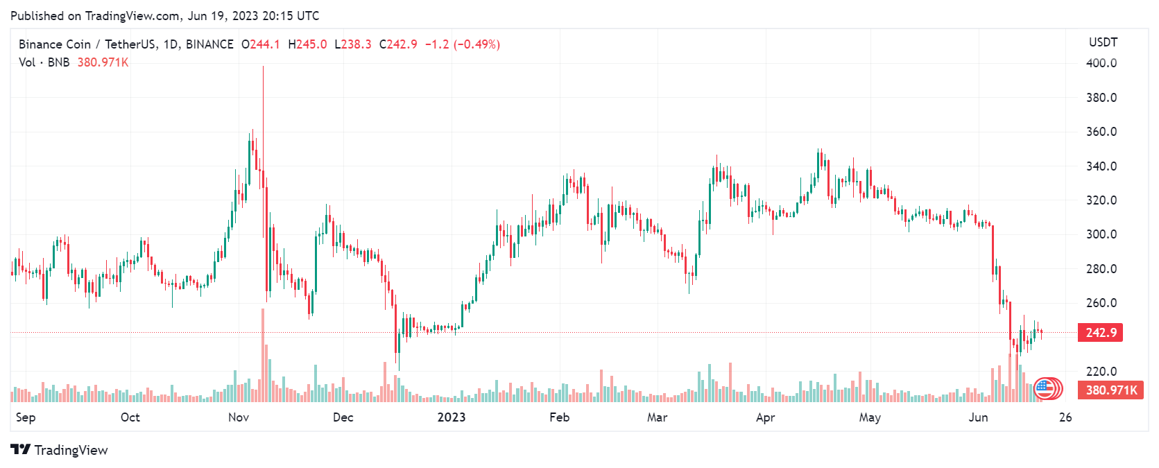 12 июня цифровая валюта Binance Coin (BNB) упала до $223, и появились рики ее обвала до $200.