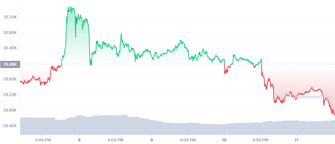 В ночь на понедельник, 13 июня BTC торгуется на отметке $27 933. Капитализация крупнейшей цифровой валюты сократилась до $532,572 млрд.