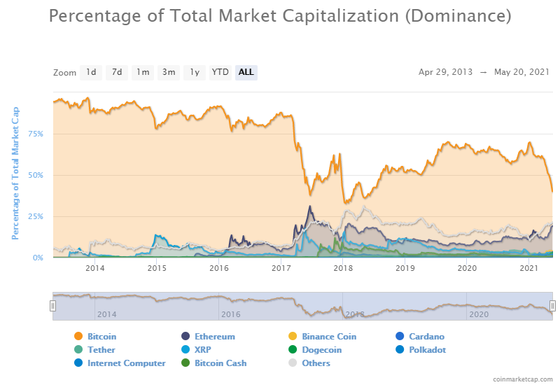 Доля биткоина на криптовалютном рынке снижается с начала 2021 года. Если в январе индекс доминирования BTC превышал 69%, то уже в мае он упал до 39,9%.