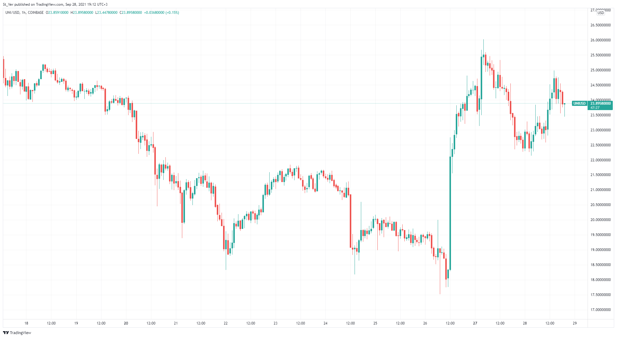 На фоне уведомлений биткоин-бирж Binance и Huobi о прекращении регистрации новых счетов для граждан Китая и планах по удалению учетных записей существующих клиентов из этой страны котировки нативного токена Uniswap на пике поднимались на 33,7% до $26.