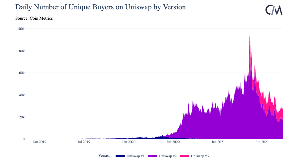Число уникальных пользователей Uniswap. Данные Coin Metrics.