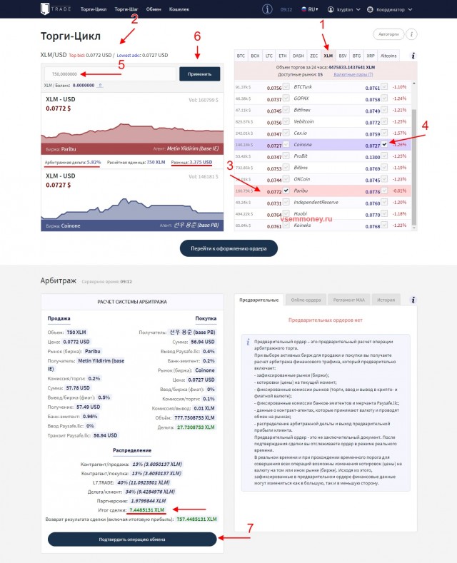 Первым делом нужно выбрать саму криптовалюту которой будем торговать. Нажимаем справа на XLM и криптовалюта выбрана (№1 на скриншоте). Затем нужно посмотреть на самый низкий и самый высокий курс для данной криптовалюты на биржах (№2 на скриншоте). Чем разница больше - тем нам лучше. Затем нам нужно отметить эти курсы в окошке справа (№3 и 4 на скриншоте). Следующий момент - ввести сумму криптовалюты которой мы желаем торговать (№5 на скриншоте). В нашем случае это 750 XLM. Затем жмём кнопку "Применить" (№ 6 на скриншоте). И подтверждаем операцию обмена (№ 7). Вот и всё. Наша сделка ушла в обработку.