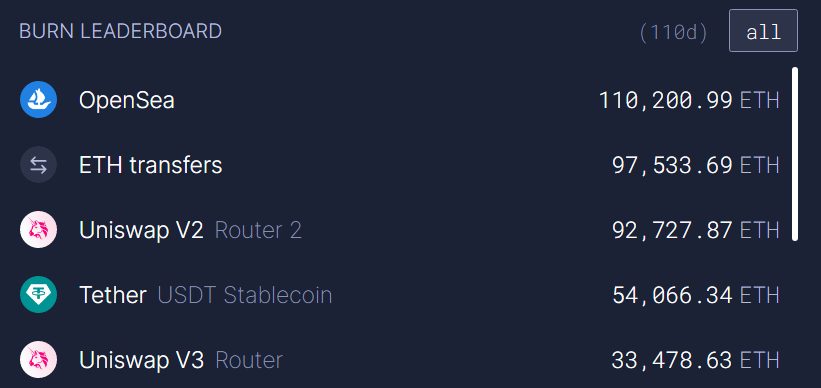 Лидером по сжиганию стал NFT-маркетплейс OpenSea (110 175 ETH). Переводы в сети уменьшили число монет в обращении — на 97 500 ETH, Uniswap V2 — 92 692 ETH.