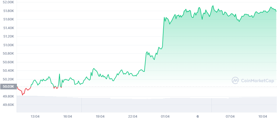 Биткоин в конце азиатской сессии вплотную приблизился к $52 000. Если ночью монета, напротив, отступала, то сейчас она укрепляет позиции на фоне активизации пользователей социальных сетей.