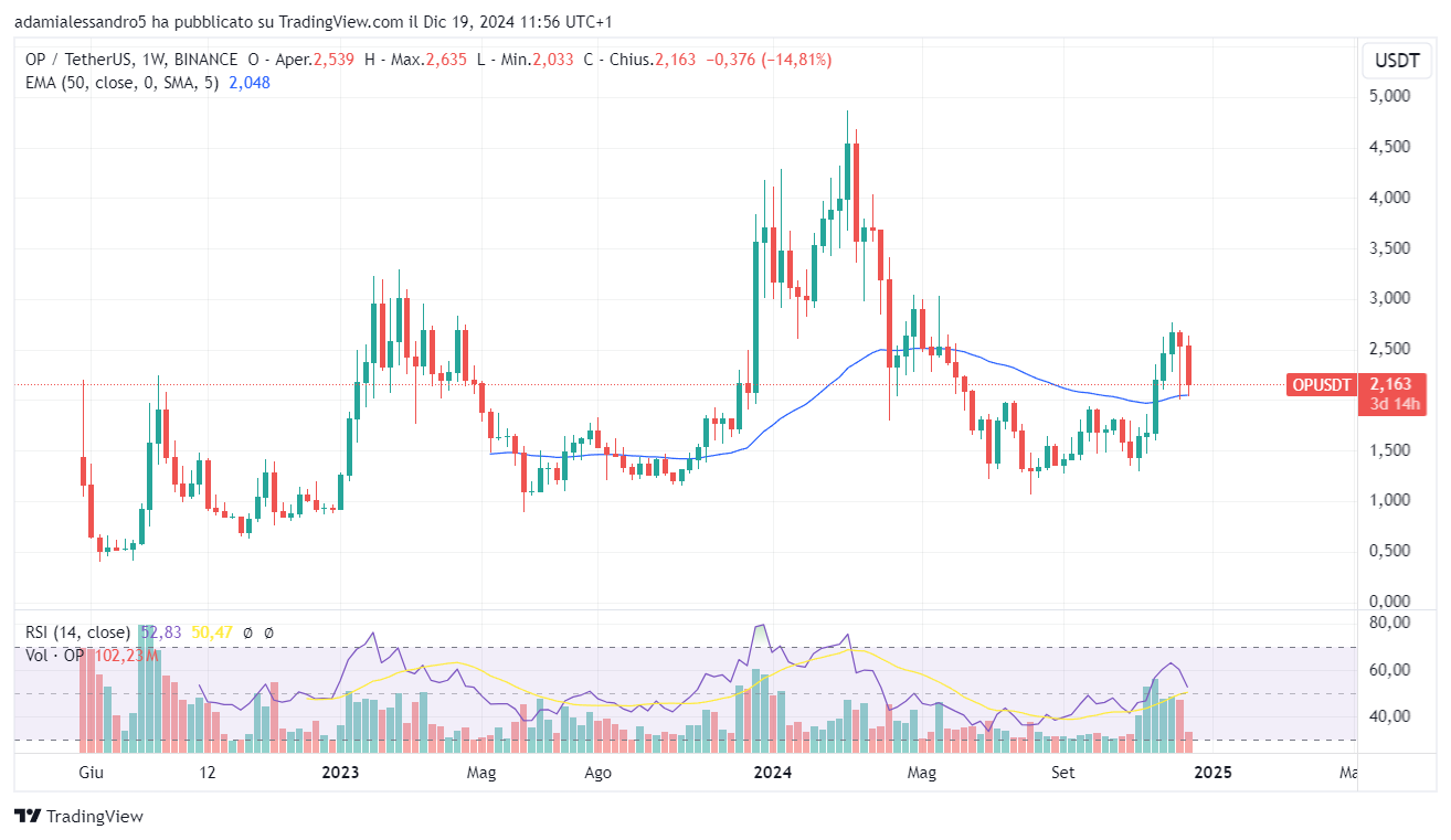 Текущие данные показывают, что OP находится немного выше недельной EMA 50 после завершения фазы роста в ноябре. Индикатор RSI свидетельствует о балансе сил между покупателями и продавцами, что создаёт условия для нового роста. При этом OP всё ещё далёк от своего исторического максимума в 4,8 доллара, что оставляет пространство для повышения цены.