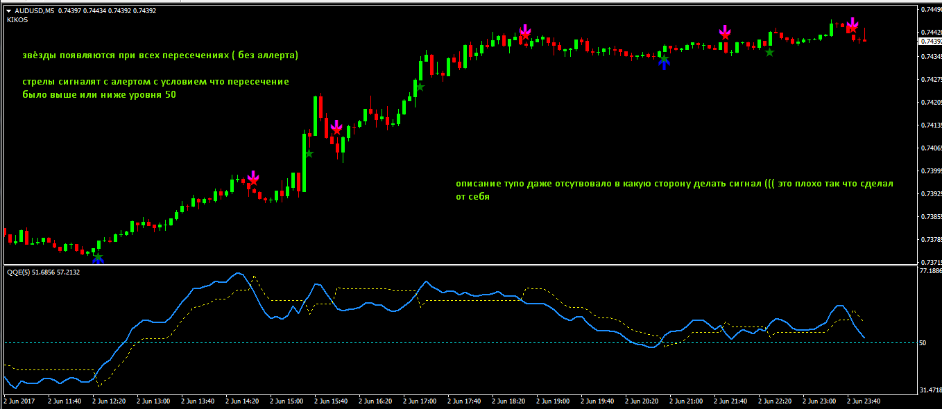 Если использовать для сигнала пересечение синий линии снизу вверх желтую линию, и при этом пересечение происходило ниже уровня 50, то вход будет более выгодным.