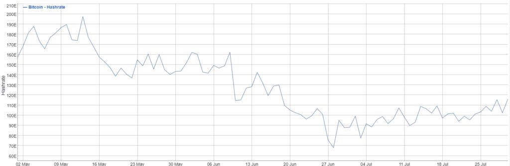 Однако в июле хешрейт начал восстанавливаться на фоне возвращения в сеть оборудования майнеров, которые перенесли бизнес из Поднебесной в другие юрисдикции.