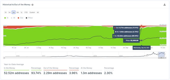 Ралли ETH привело к резкому увеличению доли прибыльных эфириум-адресов, сегодня она вплотную приблизилась к 98%.