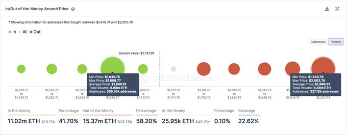 Аналитик Али Мартинес отметил, что даже если эфир опустится ниже $1700, то негатив будет недолгим. Монета сможет быстро отыграться, так как в этом ценовом диапазоне 355 000 адресов приобрели 9 млн ETH. Но если эта зона поддержки все-таки не сработает, то дном может стать отметка в $1400.