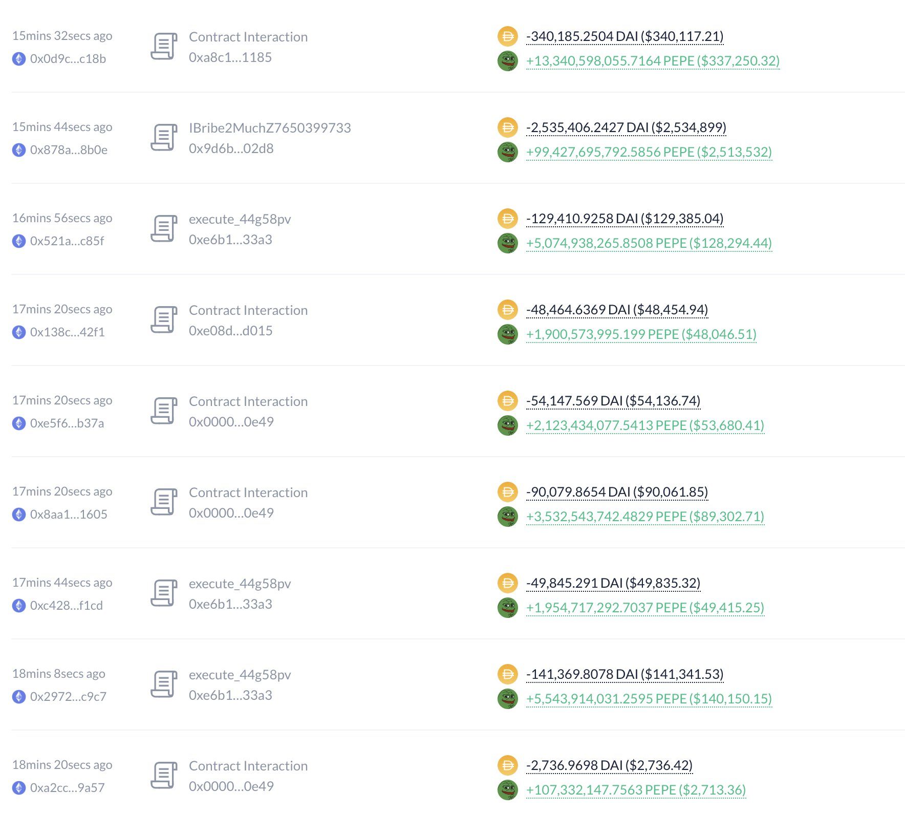 По сведениям, полученным от сервиса Lookonchain, всего за 2 часа девять кошельков, предположительно принадлежащих одному и тому же криптокиту, потратили около 13,8 млн DAI на покупку 555 млрд токенов PEPE; средняя цена за купленный токен составила всего 0,000025 доллара.