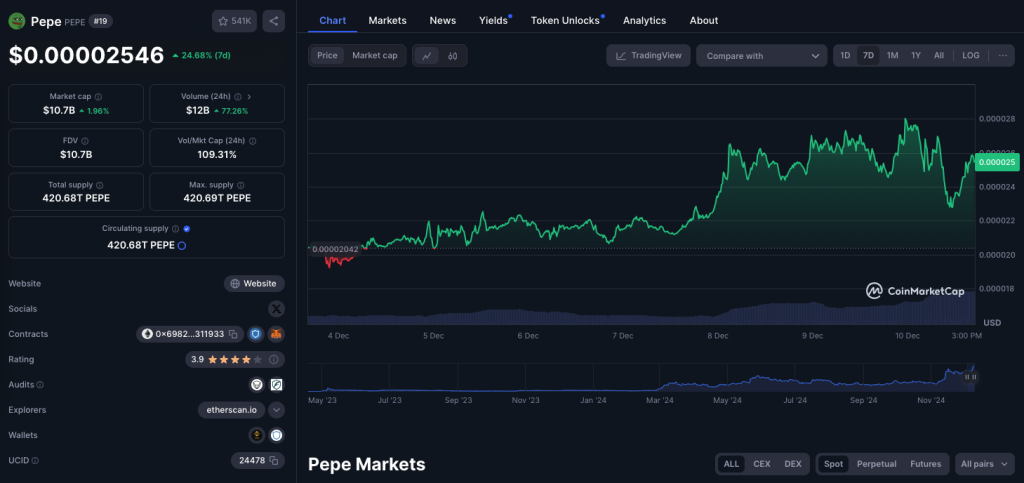 По данным CoinMarketCap , в настоящее время Pepe торгуется по цене $0,0000255, за последние 24 часа он вырос на 2%, а за последнюю неделю — на 25% .